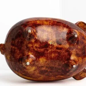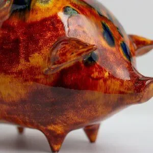 This handcrafted artistic ceramic piggy bank combines functionality with artistic appeal, featuring a vibrant abstract glaze design and a sturdy handle for easy handling. Beautifully detailed and an extremely unique color combination create an exotic and also familiar conversation piece for any room in your home.