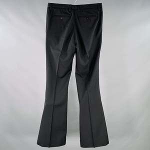 in a black wool featuring a flat front style, flared leg, and zip fly closure.Excellent Pre-Owned Condition.