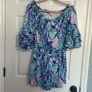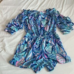 Elevate your warm-weather wardrobe with this stunning Lilly Pulitzer Calla Romper in a vibrant tropical print. This stylish and comfortable romper features a flattering off-the-shoulder neckline, flowy ruffle sleeves, and a cinched waist for a figure-enhancing fit. Made with Lilly Pulitzer’s signature lightweight fabric, it’s perfect for vacations, beach outings, brunch dates, or resort wear.