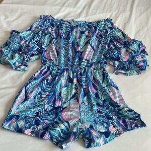 Lilly Pulitzer Calla Off the Shoulder Romper in Twilight Blue Scale Up Hard to Find