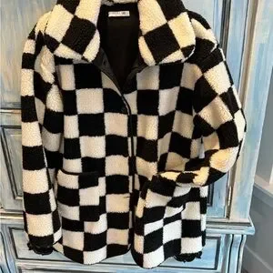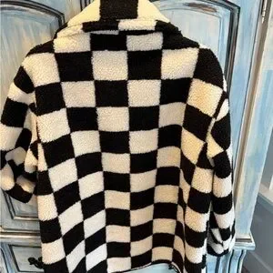 Stylish oversized jacket with a bold black and white checkered pattern. Perfect for a cozy and fashionable look. The checkered jacket is lined and has front pockets. I love the look and it is super comfortable. I have received several compliments. Fun oversized fit or regular based on your personal style.