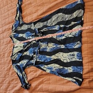 Stylish dress with a bold snake print design. Features a mix of blue, black, and white colors. Perfect for a night out.