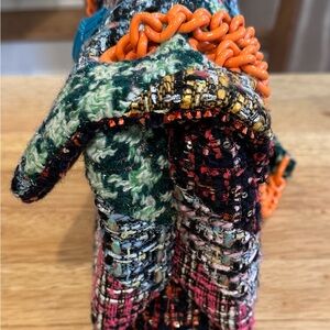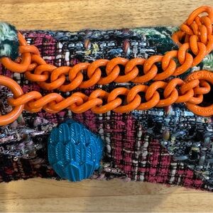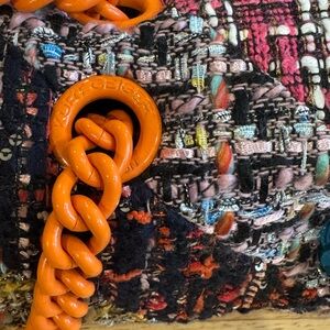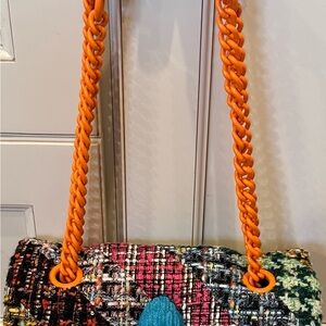 Stylish multicolor tweed bag with vibrant design. Perfect for adding a pop of color to any outfit. Magnetic-snap flap closure