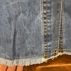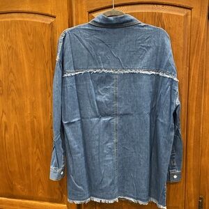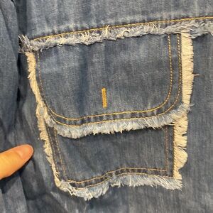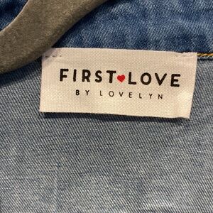 NWOT blue denim shirt by First Love. Ideal for casual outings. Can be worn open with a shirt underneath or fully buttoned. True to size. Frayed at the bottom. Two front pockets. Gives a little western vibes.