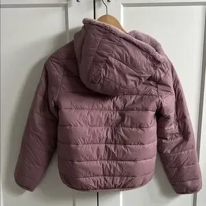 Stylish mauve puffer jacket with a cozy hood. Perfect for cold weather. This is used and shows some signs of wear but still have lots of life left. Great coat!