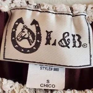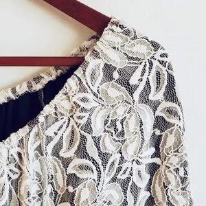 Beautiful L & B cream lace dress with brown lining and lacey edged trim on the 3/4 length bell sleeves and hem. Can be worn on or off the shoulders. Perfect dress for festivals, rodeo, night out. So feminine and would look great with cowboy boots. Excellent preowned condition. Measures 18” across the bust. It does have some stretch.