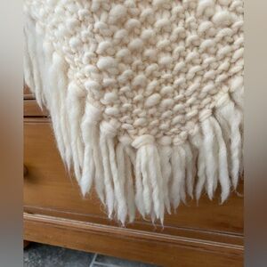 So well cared for! Babied, the softest thick yarn, 100% wool poncho with fringe, turtleneck or roll it down, hand knitted, m/l, cream, excellent condition. No balled up yarn, no spills or pulls, pet free and perfume free home, non smoking.