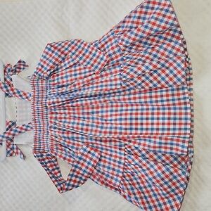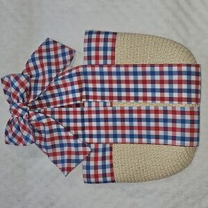 Charming red and blue plaid dress with matching bag. Features bow accents and a playful design.