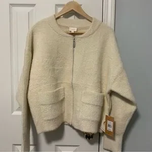 Cozy cream zip-up sweater jacket with front pockets. Perfect for layering.