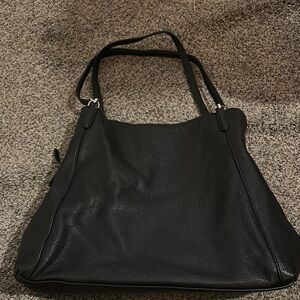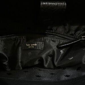 Elegant and versatile, this Kate Spade black leather tote bag is perfect for any occasion. Crafted with high-quality materials, it offers both style and functionality. 3 sections- 2 outer sections close by magnetic clasp while the inner section closes by 2 gold zippers. The outer sections have 1 zipper and 2 non-zippered pockets.