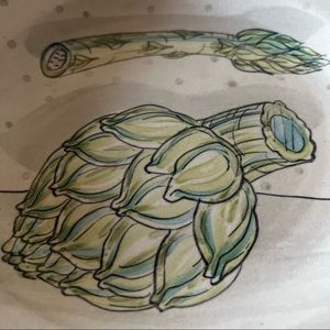 In this 9.5” plate (or shallow bowl), note her shadowing of the artichoke and asparagus spear, subtle polka dots and thin black line. Truly a piece of art to grace your table or hang on the wall (there is a hole for hanging on the back). Excellent like new condition - no cracks, chips or scuffs.