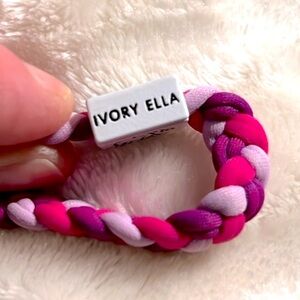 New without tags. Never worn. Stylish pink, purple and lavender braided stretch cloth bracelet by IVORY ELLA. Features Ivory Ella logo charm with black lettering.