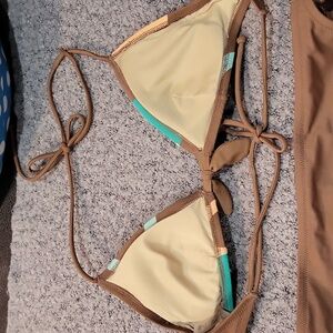 Stylish brown bikini with vibrant blue/green and orange/peach accents. Perfect for the beach.