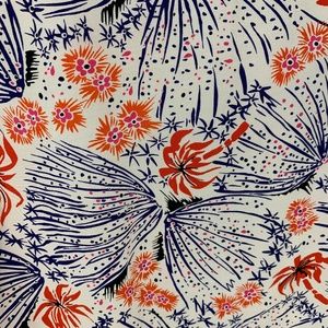 -Pale pink/peach background with red/orange palm tree and floral, blue abstract print