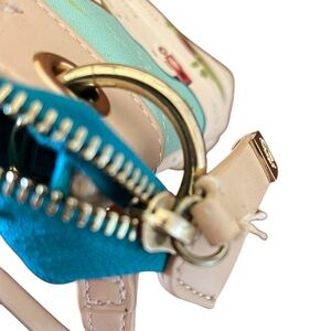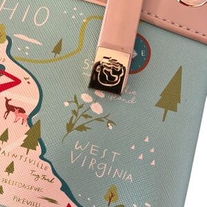 Discover the charm of this Spartina 449 women's bag, featuring a whimsical design in tribute to the great Commonwealth of Kentucky. Adjustable strap allows for 21” to 24” drop. Interior is free of rips or stains. Single inside pocket. Bag measures 12”L x 7.5” H. Received as a gift. Great bag, but I am a big bag girlie. Some distressing on the metal rings; photographed but hard to capture. The gold coating is mottled, but not flaking away or chipped. Dropped price $10 after original listing. Discovered discoloration on strap under buckle after taking original photos. Picture added to reflect that flaw.