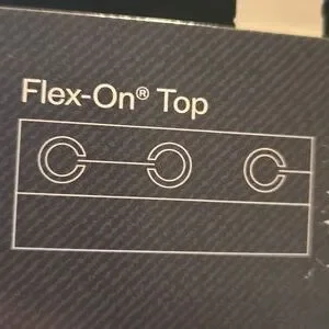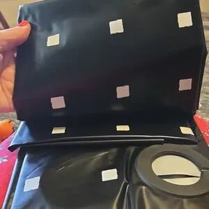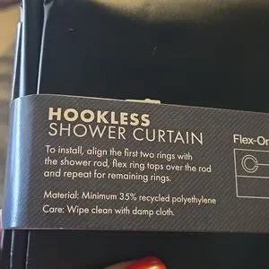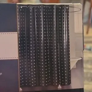 Broyhill hookless shower curtain in black with stamped squares. Easy to install with Flex-On rings.