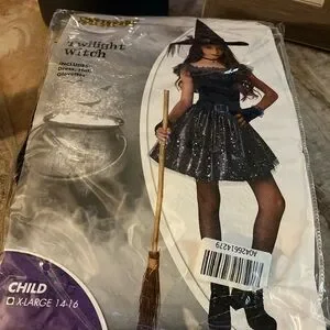 Enchanting Twilight Witch costume for kids. Includes a shimmering black dress, hat, and gloves. Perfect for magical adventures.