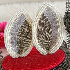 * Just in time for Easter! Red and black heavily beaded magician's hat with white bunny ears, black hearts and a big red rose.