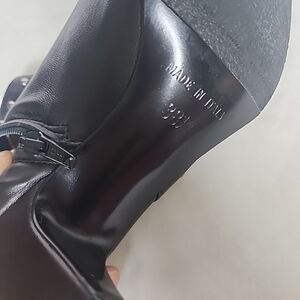 Elevate your shoe game with these stylish black leather ankle boots from Russell & Bromley. Crafted in Italy, these booties are made from high-quality leather and feature a sleek design that's perfect for any occasion. The boots are available in US shoe size 7.5 and EU shoe size 38, making them a great addition to any woman's shoe collection.