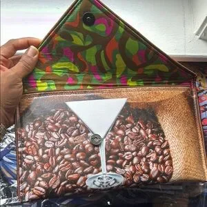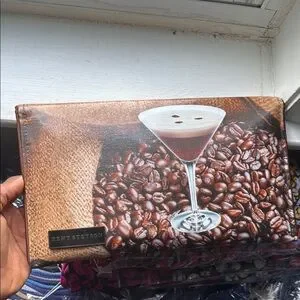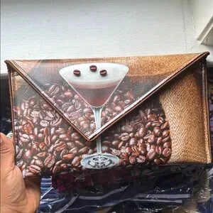 Unique Kent Stetson canvas clutch featuring a coffee bean and martini glass design. Perfect for coffee lovers. NWT, cross body chain and dust bag