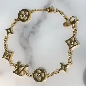 Amazing quality! Yellow titanium (we are out of rose) monogram bracelet- rare-lv finding in center. The Idylle shaped blossoms feature Natural quartz diamond. Hypoallergenic and Tarnish resistant. Adjustable 6 inches up to 8 inches.