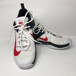 GUC Nike Women's Air Zoom Hyperace women's volleyball shoe. Known for it's comfort, support, and responsiveness. Features a forefoot Air Zoom unit and a multidirectional traction pattern for court surfaces, improves grip on hardwood and court surfaces, breathable upper, full lace up closure designed to adapt to the shape of the athlete's foot. White with black and red accents and details. Only worn a handful of times, but the toebox and laces are a bit discolored on one foot. These were my mom's and she only wore them a few times when she was coaching.