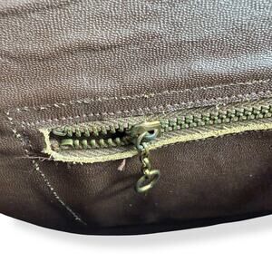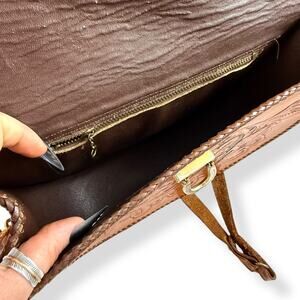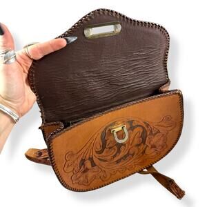 Vintage 1950's cowgirl horseshoe buckle floral tooled leather handbag. Beautiful floral tooled natural brown leather. Woven leather trim along edges. Flap with a horseshoe lock closure on front. Inside is clean leather with a small zippered pocket and open pocket. Strap can be snapped off to make it a shorter top handle bag or a shoulder bag. Beautiful vintage condition, only flaw to note is some wear and fraying to the woven leather along the top back (see photos).