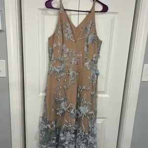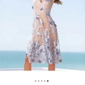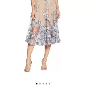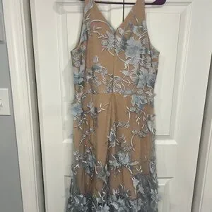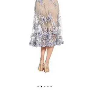Sheer layer with floral appliqués and embroidery over fitted lace base; V-back; cutaway arm openings at back