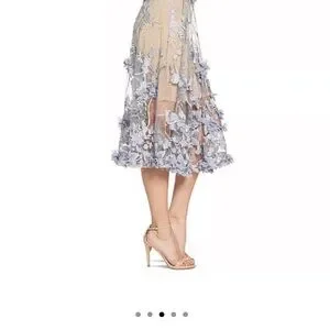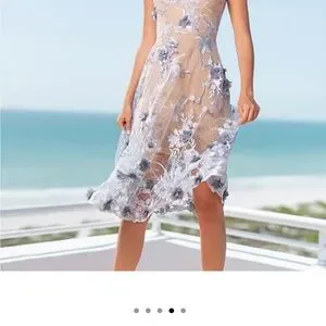 The cling of a lace mini dress pairs with the swing of a sheer embroidered appliquéd overlay. The showstopping Audrey duo-layered dazzler from Dress the Population takes center stage at a party or on a date night.