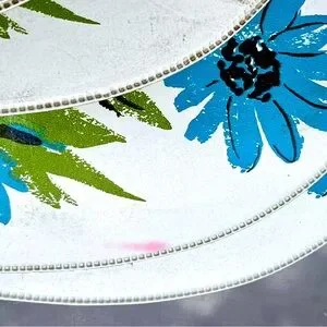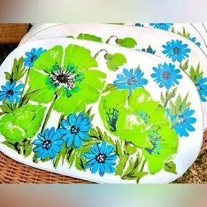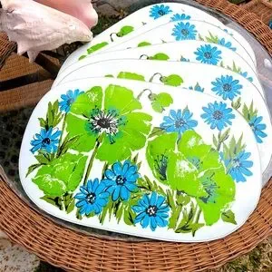 A rare set of six of these vintage 1970s placemats feature blue and apple green florals with a apple green backing.