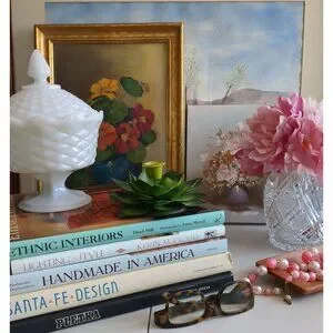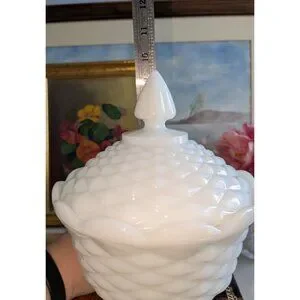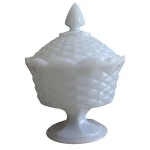 This vintage milk glass candy dish invites a sense of nostalgia with its elegant basket weave design, gracefully perched on a pedestal. Its timeless charm makes it a versatile accent, whether used to hold treats or as a radiant candle holder. The delicate craftsmanship whispers tales of yesteryears, blending functionality with beauty.