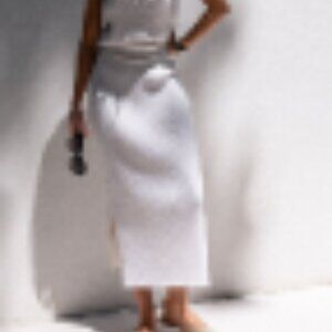 Pull-on rib sweater skirt with waist that can be worn straight or folded down. Very easy and forgiving fit. Two side slits.