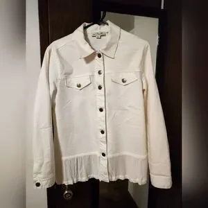 I bought this super stylish white button-up jacket with pleated hem brand new at a goodwill boutique before covid. It was a splurge for me, but I'd never seen anything like it before, and I knew it was worth it (& worth a lot more than what I paid for it). The fringe sways when you move, & the lace has a bit of stretch keeping it from fraying. It's too big for me now, so time to find it a proper home.