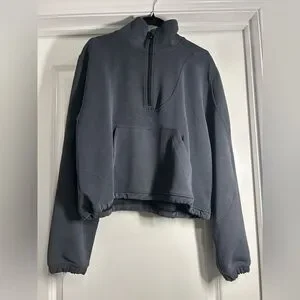 Stylish dark gray half-zip pullover with a cozy design. Features a front pocket and high collar.