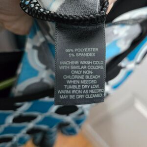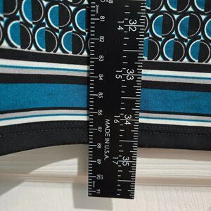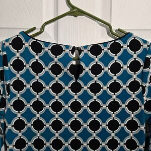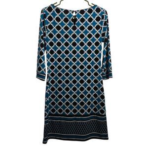 Dress to impress in the sleek and stylish White House Black Market shift dress. Designed for a versatile fit, this size XS garment is perfect for a range of occasions, from business meetings to casual outings or evening cocktails. The dress features a timeless black and blue geometric pattern that effortlessly combines modern flair with classic elegance. Crafted with a blend of polyester and spandex, this dress promises both comfort and durability. The 3/4 classic sleeves and round neckline contribute to its sophisticated silhouette, while the lightweight fabric ensures ease of movement. Practicality is not overlooked, as this dress is machine washable, making it a low-maintenance addition to your wardrobe.