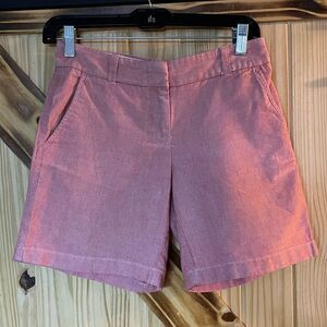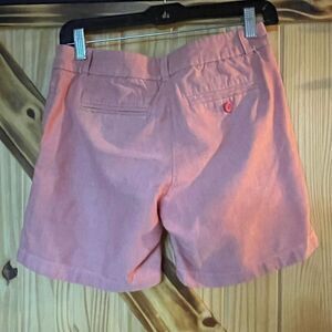 Chino style short has zipper fly with hook & eye closure. Two front pockets, two jetted back pockets (one buttoned)