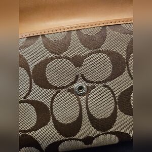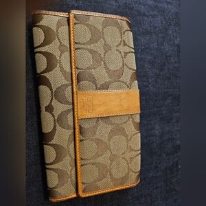 Stylish Coach wallet in brown and tan. Features signature pattern and leather accents. wallet does not have the checkbook. wallet is in excellent conditions.