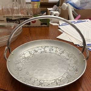 VINTAGE E.M.P.C INTAGLIO FORGED ALUMINUM SERVING BASKET/TRAY WITH HAMMERED HANDLE - FLOWER PATTERN Silver Diameter 9” Depth 1.25” Height 7.50” Manufacturing information stamped on bottom of tray. Preowned. Good condition, Pet-free and non-smoking home.
