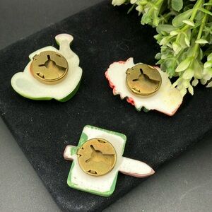 Each button cover is resin with a brass snap closure to fit around buttons. They are from 1992 with one owner in a smoke free home. Each one measures about 2 inches long and 1 1/2 inches wide. The flowers are slightly more narrow at 1 inch wide.