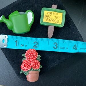 Grow your style with these whimsical resin button covers. Show off your hobby when you snap on this charming set featuring a green watering can, “keep off the grass” sign, and vibrant red flowers. Perfect for adding a touch of fun to your everyday shirts.