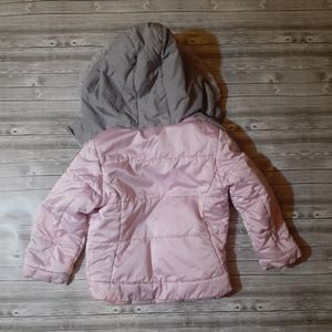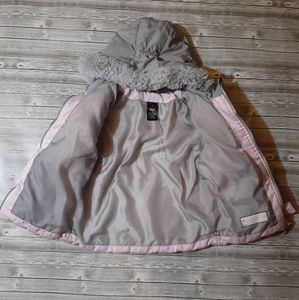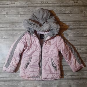 Size 5 girls rose most (pink/gray) colored 2-in-1 hooded outdoor jacket. Jacket: faux fur trim (part of the fur seems matted) hood that is not removable, zippered front/pocket closures w/pull tabs on zippers, attached rubber logo upper left, & name placement label inner bottom left of jacket. Sweater Jacket: can be worn w/without the outer jacket, front zippered closure, 2 functional pockets, shoulders/lapel area fuzzy faux fur, & hang hook tab on back. See photos. Ask if you have questions. Thanks for stopping by!