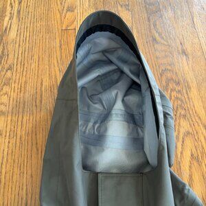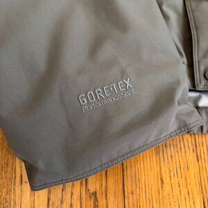Olive green 100% polyester fishing wading jacket. Gore-Tex Performance Shell. Excellent condition with the exception of some discoloration/stains at both wrist areas and front pocket. Visible on last two photos. Otherwise perfect. Many features including stiffened hood brim, back of neck hood tightener, face hood tightener, double front closure with zipper and velcro. Jacket also has an elastic waistband with an adjustable tightening option. Very large front pockets, 8" x 11" with large flaps and velcro closure. Pockets also have a side access pocket. Inner wristbands are elastic and also have velcro closure.