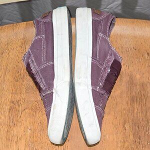 Womens size 7. Preowned in good condition. Features canvas uppper with elastic "laces" for easy on and off. Features distressed edges and contrast stiching in plum wine color.