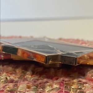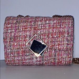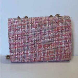Stylish pink tweed crossbody bag with a gold chain strap. Features a unique geometric clasp.