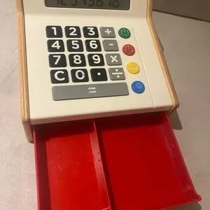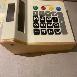 Fun wooden toy cash register with colorful buttons. Does not include play money. Perfect for pretend play.