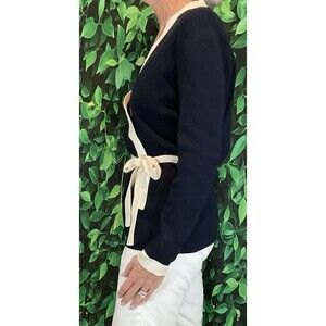 Ann Taylor Navy Blue Long Sleeve Silk Wrap Sweater W/ Cream Trim Side Tie SZ M