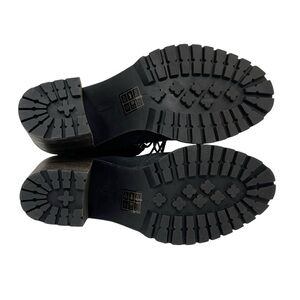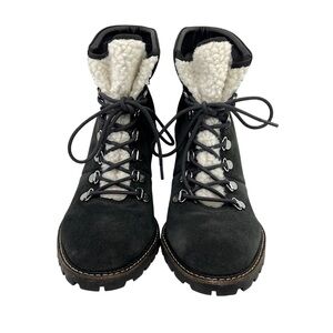 Hiking boots reimagined with chunky heels and trimmed with faux shearling at the tongues.
