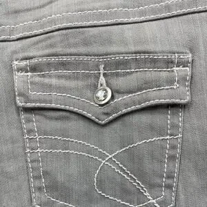 INC International Concepts offers brand new Women's Regular Fit Gray Bootleg Jeans in size 8, complete with new tags. These mid-rise, stretchable gray jeans boast a bootleg cut and are embellished for added flair. Crafted from a cotton and spandex mix, they feature a classic five-pocket design, rhinestone details, and a button and zip closure, making them versatile for both daytime and evening wear.