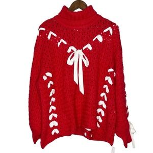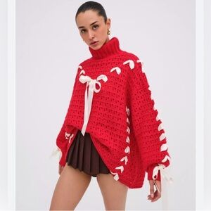 Chic and cozy red sweater featuring elegant bow accents. Perfect for adding a pop of color to your wardrobe.
