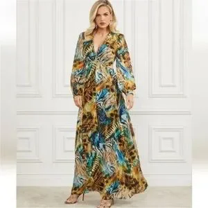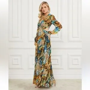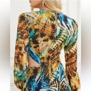 Embrace elegance with this stunning multicolor maxi dress. Perfect for any occasion, it features a vibrant mix of colors that will make you stand out. Gold chain trim around v-neck and side cut-outs.